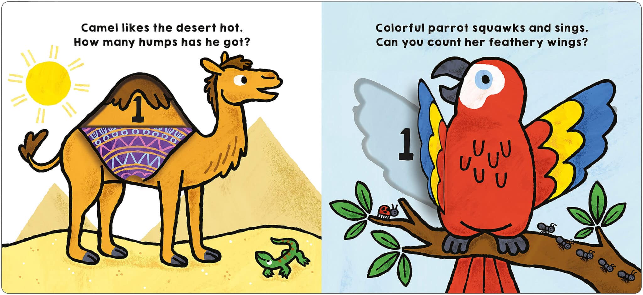 Introduce toddlers to theirย first numbers! Young children will love exploring theย vibrant illustrationsย and lifting theย shaped flapsย to reveal the numbers. From elephants and puppies, to parrots and sea creatures, toddlers can learn toย count from 1 to 10ย with help from the friendly animals.