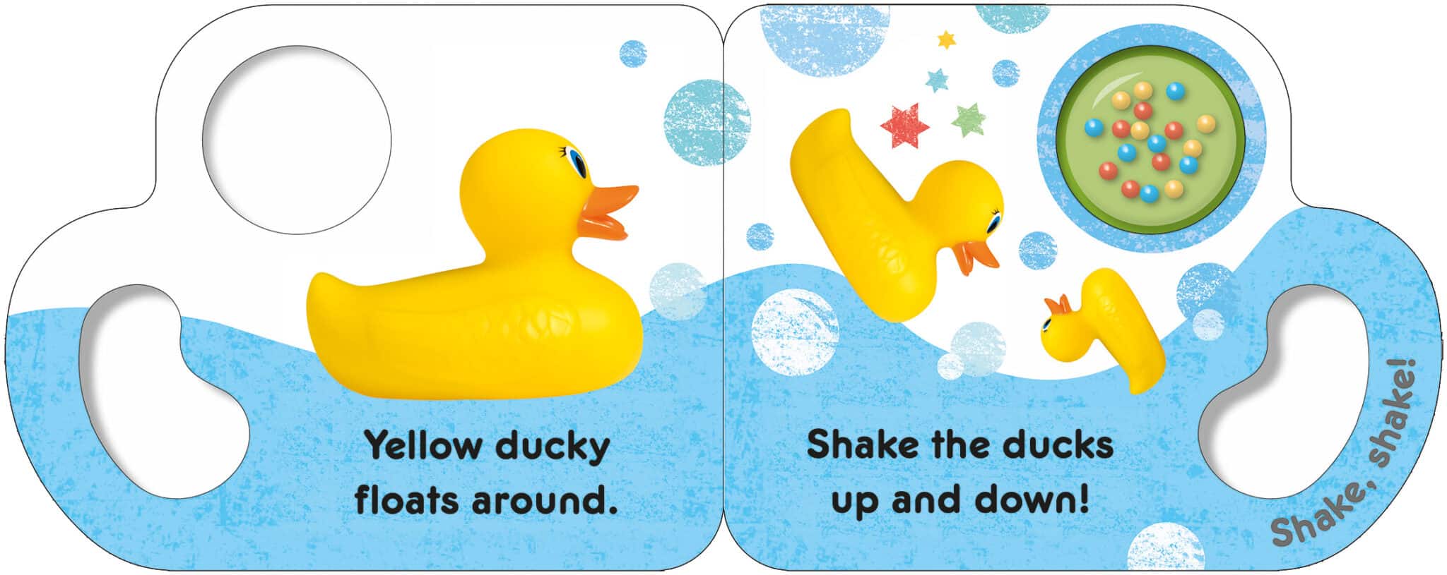 This exciting novelty board book is the perfect size and shape for small hands to hold with its curved grip shape. There is a die-cut on every page which shows a colorful rattle which baby can shake themselves. Each page has a different first word to learn and fascinating photographs to encourage word and picture recognition. The bouncy rhyming text will help develop speaking skills and asks the child to participate in an action: