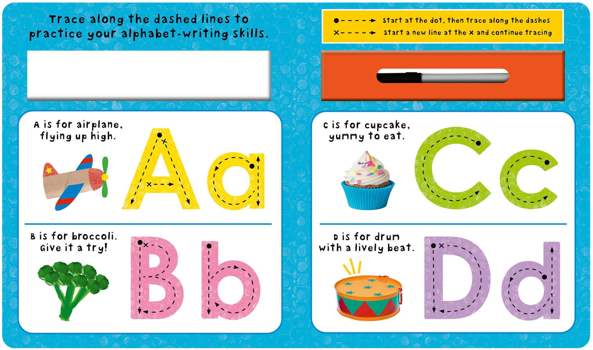 A dry erase pen inside a box is embedded into the design of the book in an eco-friendly way, ensuring the book and pen stay together! Kids can trace their letters, then wipe the page clean and try again, for hours of educational fun.