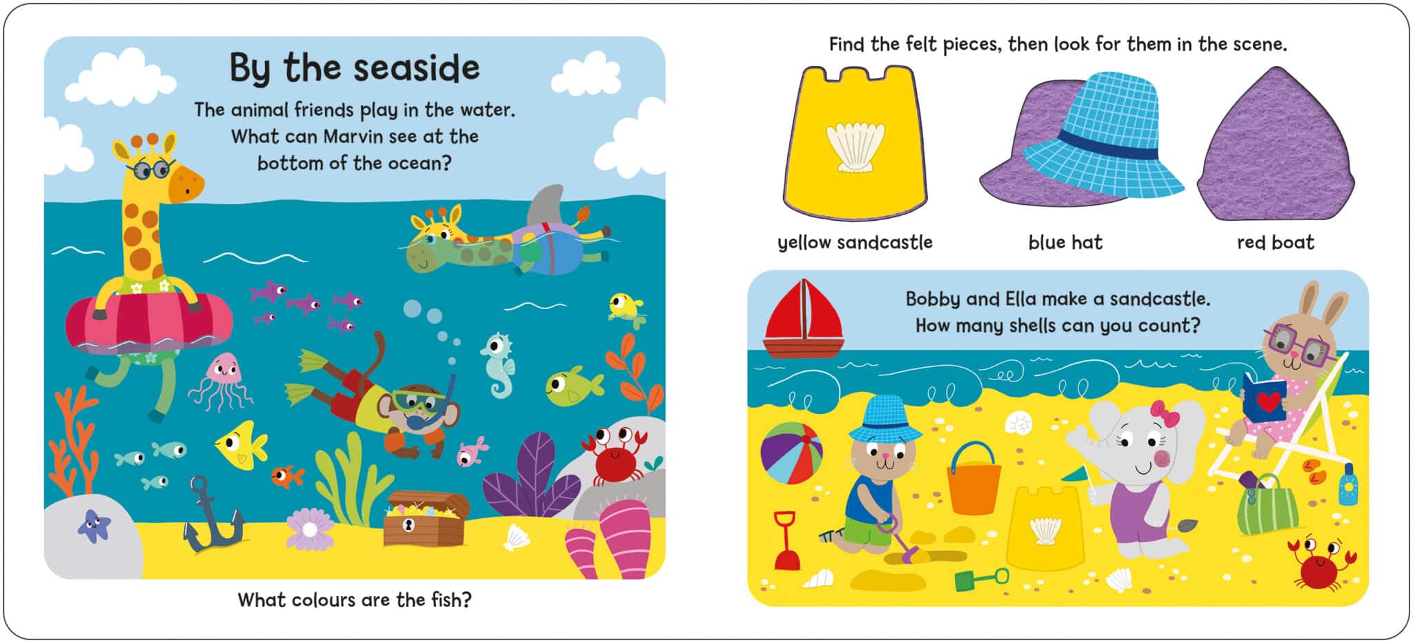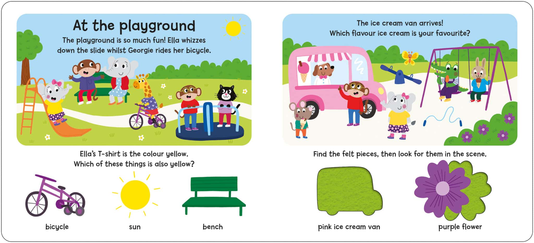 This interactive board book is designed to teach young children about first concepts in a fun and innovative way. Each spread introduces a different colour and children have to find the correct piece to place on the felt board page. As well as this, the cover also folds out into a gatefold with a felt backed colour sorter for children to find and place their felt pieces once they’ve completed the book.